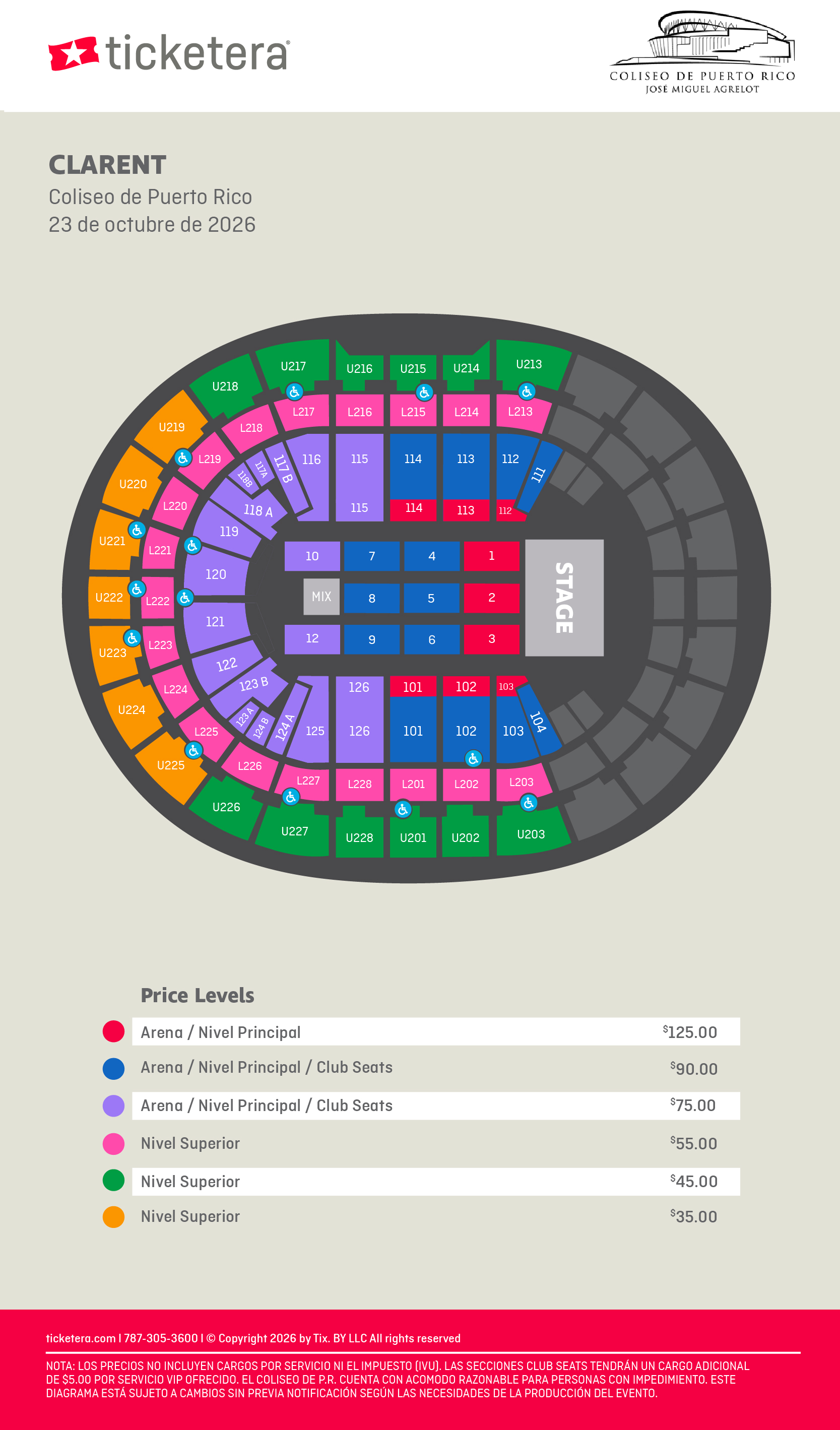 Por política del Coliseo y por su seguridad, se requiere que todo menor de 15 años o menos deben estar acompañados por un adulto mayor de 21 años en todo momento. Esta regla aplica para todos los eventos que se llevan a cabo en el Coliseo de Puerto Rico.