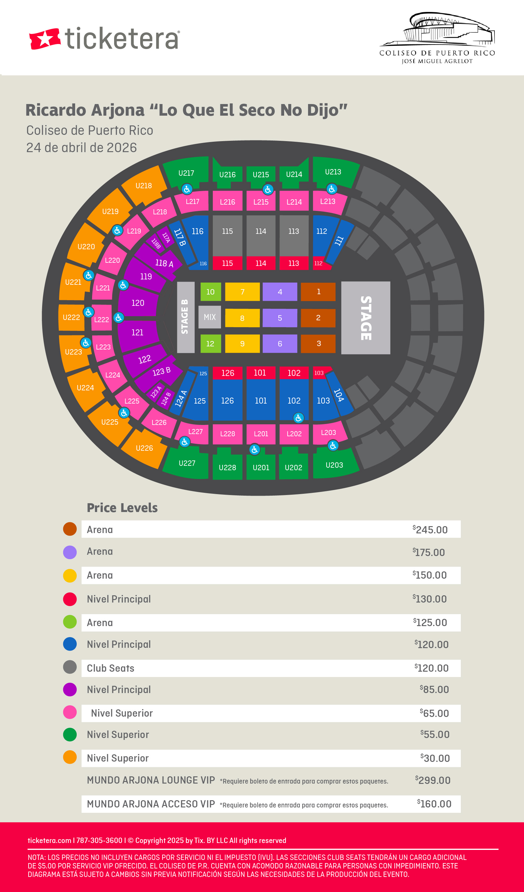 Por política del Coliseo y por su seguridad, se requiere que todo menor de 15 años o menos deben estar acompañados por un adulto mayor de 21 años en todo momento. Esta regla aplica para todos los eventos que se llevan a cabo en el Coliseo de Puerto Rico.